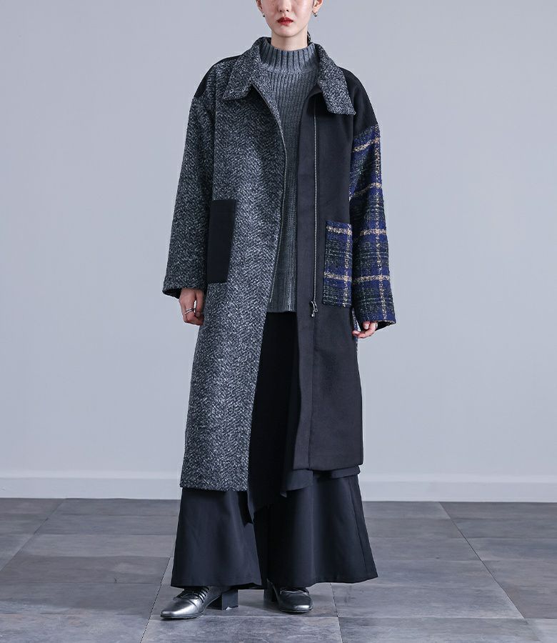 デザイン3つの生地を切り替えた、アシンメトリーなデザインがお洒落なコート。スタンドカラーがシャープな印象で、首元まで暖かな一着です。 コーディネート一着でインパクトのあるコートなので、シンプルなコーディネートの上に羽織るだけでモードな世界観たっぷりな着こなしが完成します。 素材ヘリンボーン柄生地・チェック柄生地・無地のメルトン生地の3種類を使用。滑りの良い裏地付きで、ニットなどを着てももたつかずさっと羽織れます。 スタッフ試着データstaff:T/159cmB77 W58 H91【普段着用】Tops:S/MBottoms: M/L【1】袖丈:指の真ん中位着丈:ひざが隠れる位腕周り:ゆったりバスト:ゆったり全体:ゆったりゆったりと着用出来ましたが、すっきり見えました。【2】袖丈:指先が少し見える位着丈:ひざ下3cm位腕周り:ゆったりバスト:ゆったり全体:ゆったりよりゆった